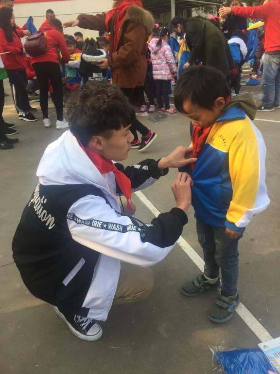 接着,乌咀乡的少先队员代表们依次上台为此次到来的爱心人士系上红领巾,爱心公益人士和美术系团学会成员们也为这些小朋友们当场换上崭新的校服,还给校方捐赠了教学器材等,充分体现了本次公益活动的主题“砼心砼行,筑梦校园”的精神,为这些祖国的花朵提供了更好更无忧的学习和成长环境。